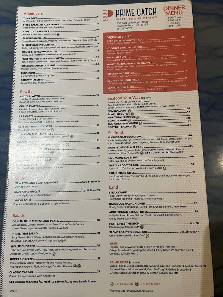 Introducing Prime Catch, a New American Seafood restaurant located in Boynton Beach, Florida. Known for their diverse menu and waterfront views, Prime Catch offers a variety of options for all tastes. From their Raw Bar featuring fresh oysters and shrimp cocktails to appetizers like Baby Zucchini Fries and Crispy Thai Shrimp, there is something for everyone to enjoy. Their soups, including Blue Crab Bisque and New England Clam Chowder, are sure to warm you up on a chilly evening. Customers rave about the attentive service and delicious food, making it a top choice for special occasions or casual dining. With options for outdoor seating, happy hour specials, and private dining, Prime Catch caters to a wide range of preferences. Whether you're looking for a romantic dinner or a fun night out with friends, Prime Catch has it all.